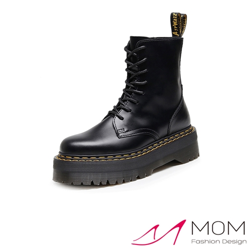 真皮個性雙縫線百搭8孔厚底馬丁靴 黑*MOM* |