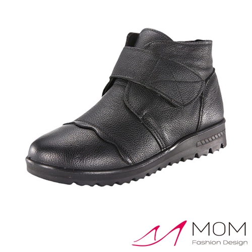 真皮頭層牛皮舒適小圓頭魔鬼粘舒適厚底短靴 黑*MOM* |
