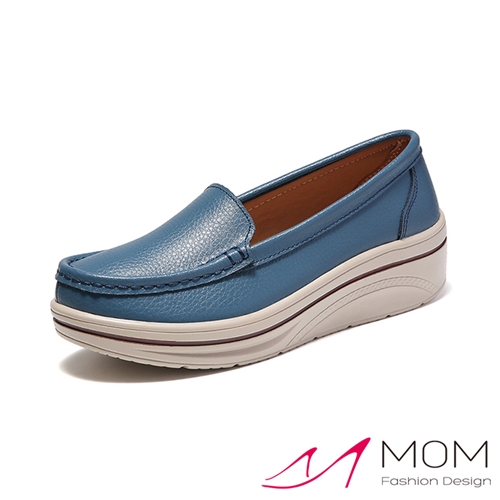 真皮純色氣質百搭坡跟厚底樂福鞋 藍*MOM* |