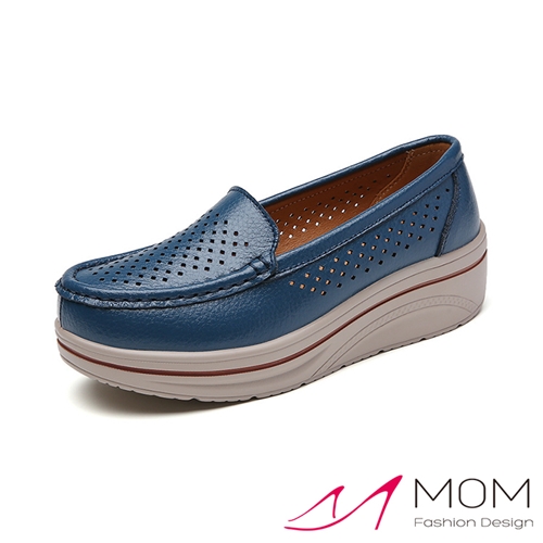 真皮純色氣質縷空沖孔百搭坡跟厚底樂福鞋 藍*MOM* |