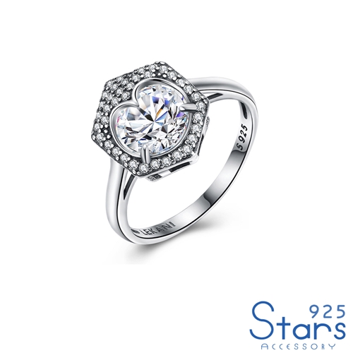 純銀925閃耀華麗鋯石六角愛心造型戒指 白金色*925 STARS* |