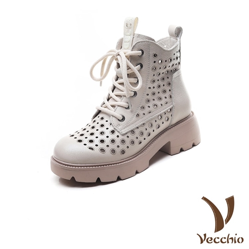 全真皮頭層牛皮幾何圈圈縷空繫帶粗跟馬丁靴 涼靴 米*VECCHIO* |