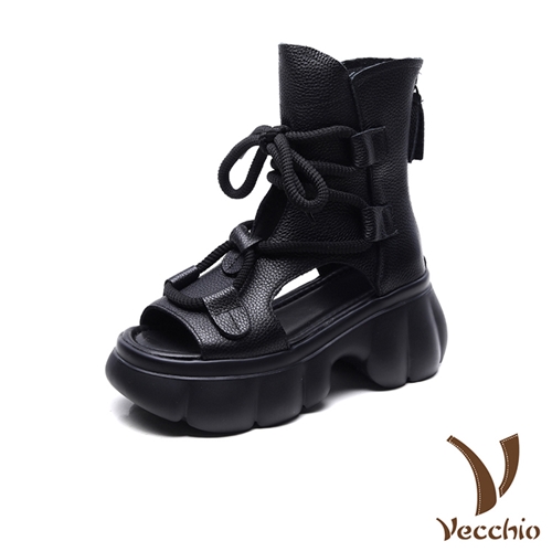 真皮頭層牛皮魚口露趾鬆糕厚底繫帶羅馬涼鞋 涼靴 黑*VECCHIO* |