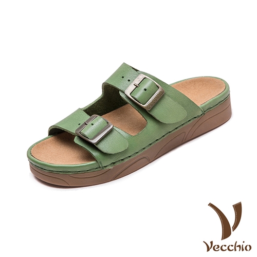 真皮頭層牛皮經典復古皮帶釦飾舒適厚底拖鞋 綠*VECCHIO* |