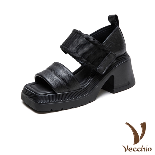 真皮頭層牛皮撞色方頭防水台厚底高跟涼鞋 黑*VECCHIO* |