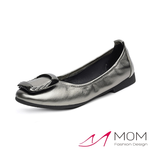 真皮頭層牛皮金屬亮皮鑲鑽方釦低跟鞋 摺疊鞋 銀*MOM* |