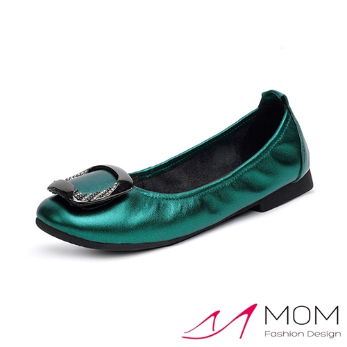 真皮頭層牛皮金屬亮皮鑲鑽方釦低跟鞋 摺疊鞋 綠*MOM* |