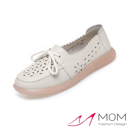 真皮舒適軟底縷空花朵蝴蝶結綁帶休閒樂福鞋 米*MOM* |