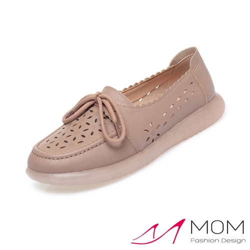 真皮舒適軟底縷空花朵蝴蝶結綁帶休閒樂福鞋 豆沙*MOM* |