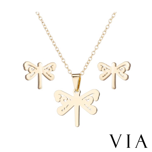 [快速出貨] 昆蟲系列 幾何花紋蜻蜓白鋼耳釘項鍊套組 金色*VIA* |