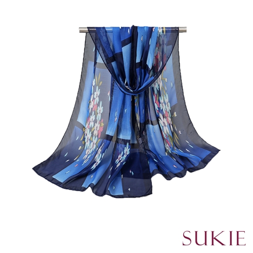 [快速出貨] 幾何撞色窗框花朵印花50X150雪紡紗圍巾 4色任選*Sukie* |