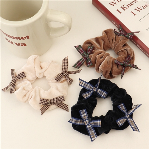 [快速出貨] 甜美毛絨格子蝴蝶結造型大腸圈 髮圈 3色任選*MISA* |
