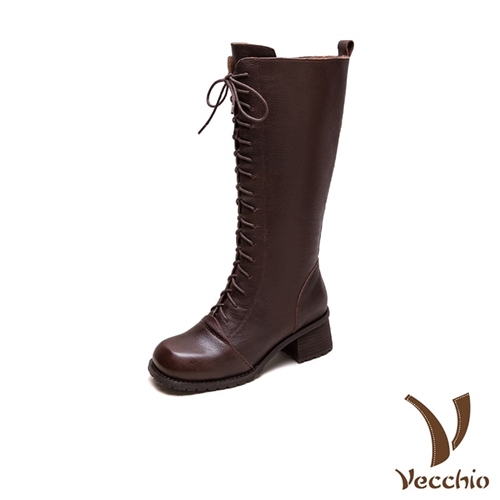 全真皮頭層牛皮經典繫帶百搭粗跟長靴 棕*VECCHIO* |