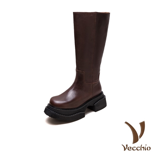 全真皮頭層牛皮純色百搭粗跟個性長靴 咖*VECCHIO* |