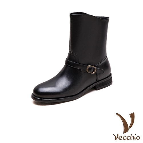 全真皮頭層牛皮細緻皮帶釦飾低跟百搭中筒靴 黑*VECCHIO* |