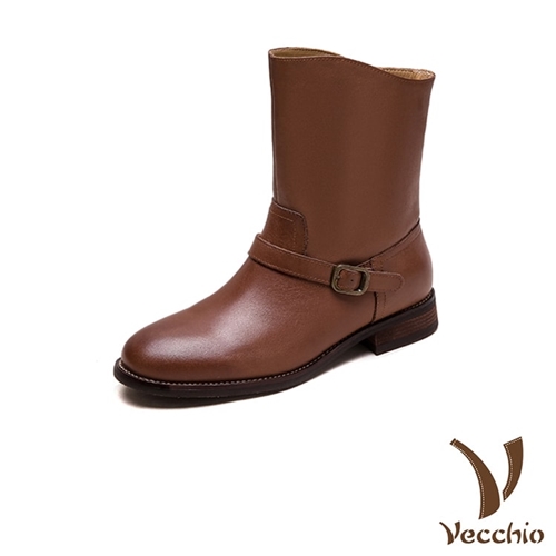 全真皮頭層牛皮細緻皮帶釦飾低跟百搭中筒靴 棕*VECCHIO* |