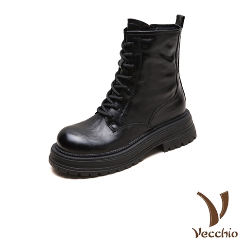 真皮頭層牛皮經典細膩皮紋繫帶休閒中筒靴 黑*VECCHIO* |
