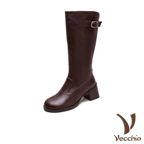 全真皮頭層牛皮修飾顯瘦版型粗跟長靴 咖*VECCHIO* |