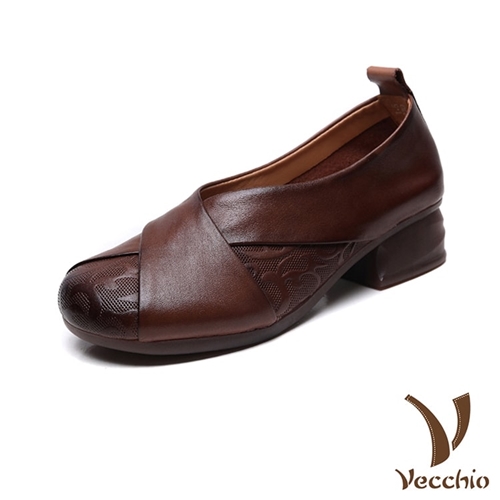 全真皮頭層牛皮皮雕交叉帶設計小圓頭粗跟鞋 棕*VECCHIO* |