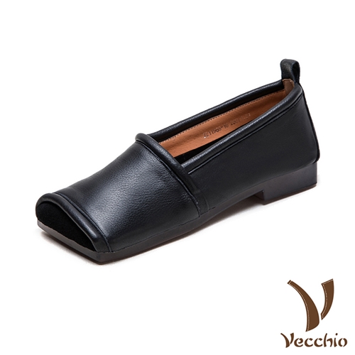 全真皮頭層牛皮舒適立體方頭低跟便鞋 黑*VECCHIO* |