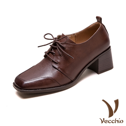 真皮頭層牛皮典雅方頭繫帶粗跟皮鞋 棕*VECCHIO* |
