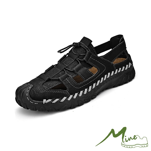 真皮個性拼接手工縫線護趾包頭便利束帶戶外休閒涼鞋 黑*MINE* |