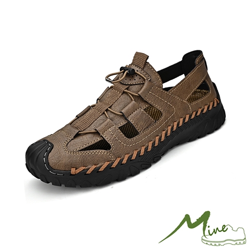 真皮個性拼接手工縫線護趾包頭便利束帶戶外休閒涼鞋 棕*MINE* |