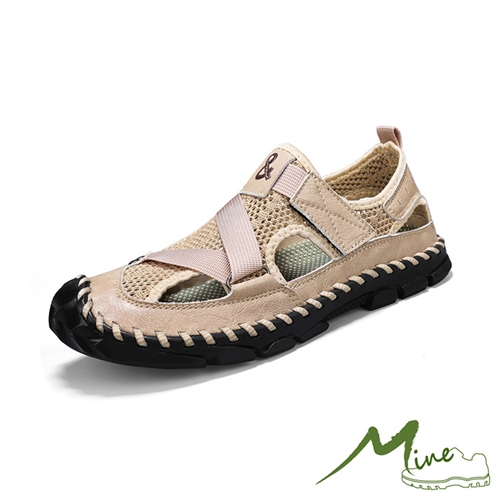 手工縫線透氣網布Z字帶拼接戶外休閒涼鞋 卡其*MINE* |