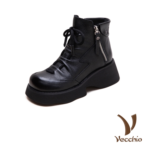 真皮頭層牛皮復古蝴蝶結繫帶坡跟厚底短靴 黑*VECCHIO* |