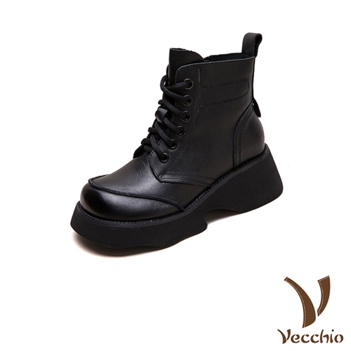 真皮頭層牛皮典雅車線拼接坡跟厚底短靴 黑*VECCHIO* |