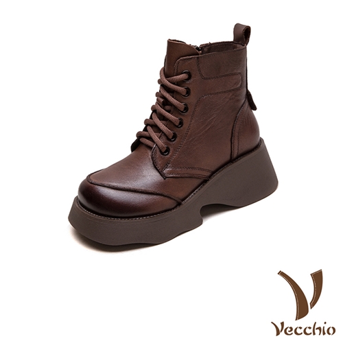 真皮頭層牛皮典雅車線拼接坡跟厚底短靴 咖*VECCHIO* |