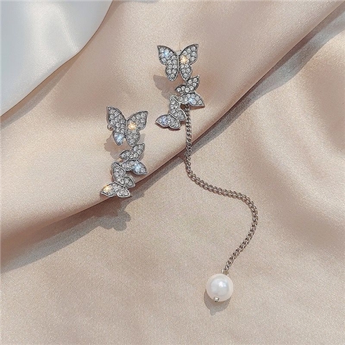 [快速出貨] 不對稱微鑲美鑽蝴蝶珍珠長墜耳環*Secret Box* |