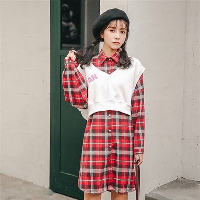 V領馬甲背心休閒格子長襯衫兩件式套裝 紅 |