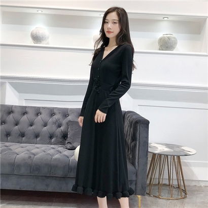 V領收腰顯瘦氣質木耳邊綁帶連身洋裝 3色任選 |