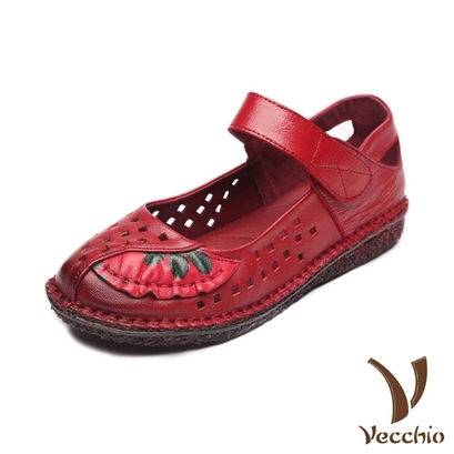 真皮頭層牛皮民族風印花拼接縷空透氣超軟底平底娃娃鞋 紅 |
