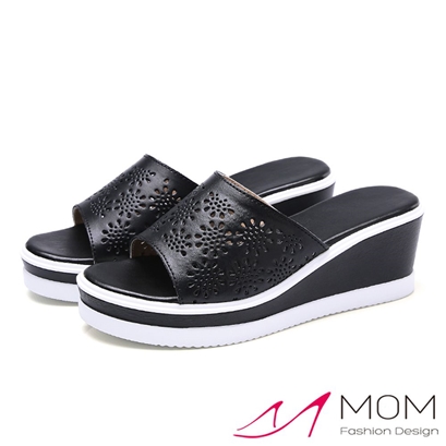真皮黑白撞色甜美花朵沖孔時尚坡跟拖鞋 黑 |