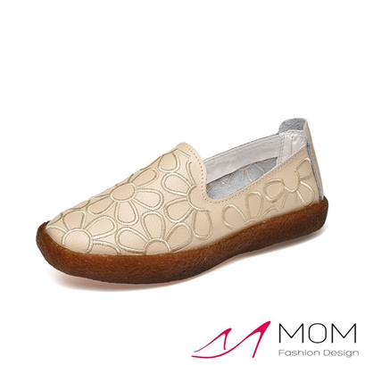真皮花朵立體繡線軟底舒適平底鞋 米 |