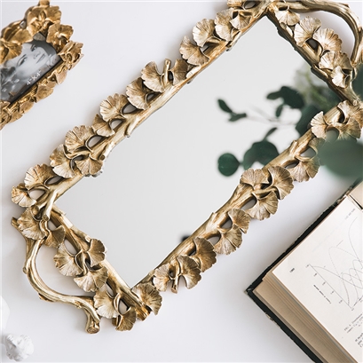 長方形銀杏葉復古雕花金色鏡面點心甜品咖啡托盤 |