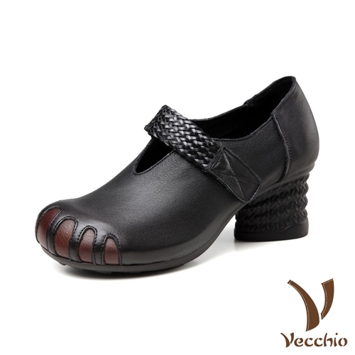 真皮頭層牛皮典雅粗跟編織帶復古深口百搭高跟鞋 黑 |