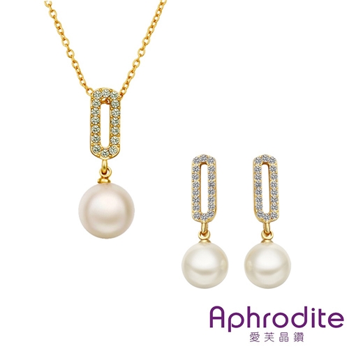 [快速出貨]方型排鑽造型珍珠耳環項鍊套組(黃金色)*愛芙晶鑽* |