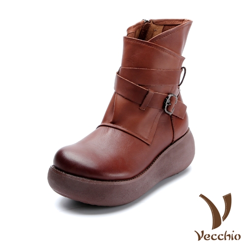 真皮頭層牛皮隨性皮帶釦造型鬆糕厚底休閒短靴 棕 |