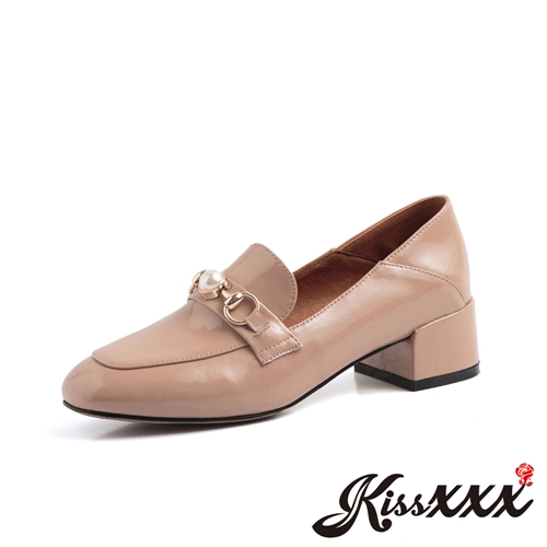 全真皮兩穿法小方頭珍珠釦件特殊方跟鞋 杏 |