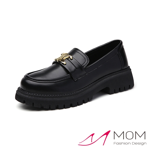 真皮時尚金屬釦飾個性粗跟厚底樂福鞋 黑*MOM* |