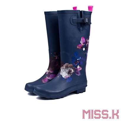潑墨技法花朵彩繪防水長筒雨靴 藏青 |