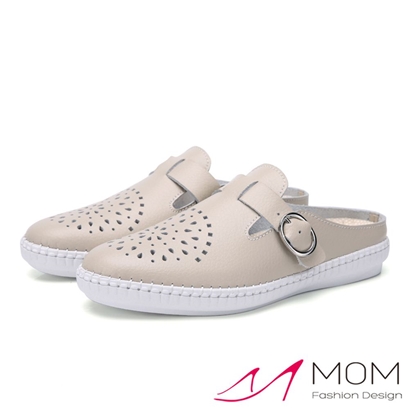 真皮透氣花型沖孔皮帶釦飾手工縫線包頭平底拖鞋 米 |