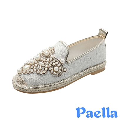 華麗美鑽珍珠蕾絲網紗草編拼接低跟樂福鞋 白 |