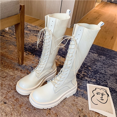 潮流時尚針織拼接復古長筒馬丁靴 米 |