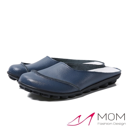 真皮小圓頭立體車線造型包頭舒適軟底豆豆拖鞋 藍 |