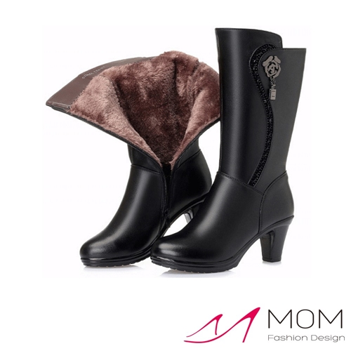 真皮唯美花飾貼鑽造型高跟中筒靴 黑/棕 |