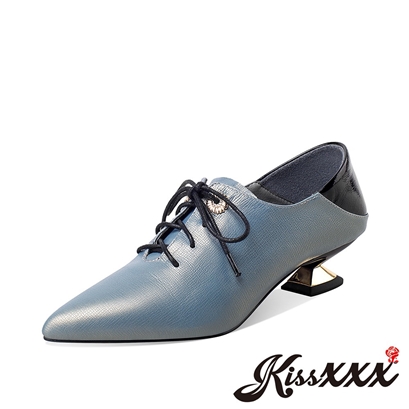 全真皮復古尖頭美腿效果金屬粗跟踝靴 藍 |